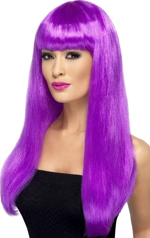 Peruca cu parul lung, coafura cu parul drept si breton. Culoare: mov.