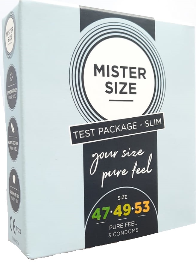 Cu pachetul de testare de la Mister Size aveti o gama de dimensiuni de prezervative gata de probat. Incercati-le in liniste, in timpul liber si vedeti care se simte cel mai bine. Cu latimi de 47 mm, 49 mm si 53 mm, cel putin unul dintre ele se va potrivi mai bine decat prezervativele folosite anterior. Acest pachet este ideal pentru cei care nu si-au gasit inca prezervativul perfect si nu vor sa achizitioneze seturi intregi de prezervative de marimi diferite. Acum aveti unul care va va permite sa-l alegeti pe cel potrivit. Acestea sunt fabricate din latex, cu rezervor, lubrifiate, extra subtiri pentru senzatii uimitoare.