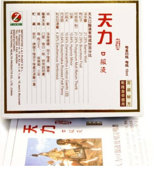 Tianli Cresterea Potentei este preparat din ierburi salbatice proaspete. Solutia este obtinuta in urma unui proces de pregatire, tratare, rafinare si extragere. Tonifica trupul si revigoreaza impulsul sexual. Mod de administrare: Se recomanda o fiola de 10 ml cu 40-60 minute inainte de actul sexual. este recomandat barbatilor cu disfunctii erectile (impotenta) este indicat persoanelor care doresc sa obtina performante sexuale crescute pentru ameliorarea starilor de stres si oboseala, slabiciune, incaruntire prematura. Avertisment: Nu se recomanda persoanelor cu hipertensiune. A nu se depasi consumul unei fiole pe zi A nu se consuma bauturi alcoolice inainte de administrare Nu se recomanda adolescentilor Se recomanda consumul cu precautie pentru persoanele hipertensive si cu afectiuni cardiace grave.В Cititi cu atentie prospectul din interiorul ambalajului, inainte de folosire. Ingrediente: Epimedium grandiflorum; Polygonum multiflorum; Eleutherocus Senticossus; Hypoxis Minor; Bosschniakia Rossiea; Boxrohorn Fruit; Damnacanthus Lidcus Gaerti.