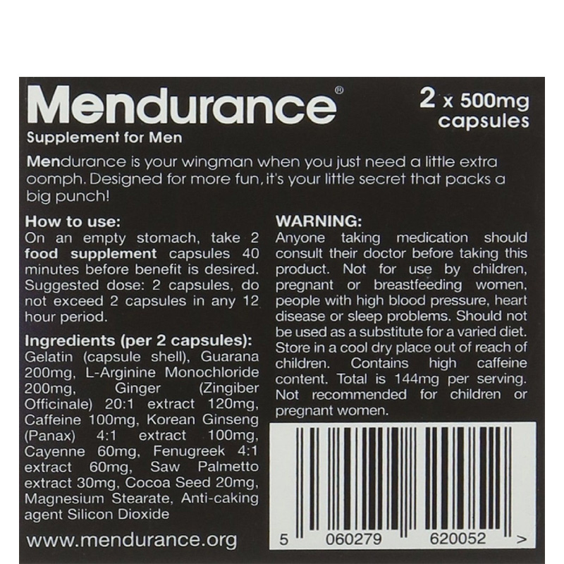 Capsulele Mendurance sunt pilotul tau cand ai nevoie doar de un pic mai mult !Concepute pentru mai multa distractie, sunt micul tau secret ce impacheteaza o lovitura mare ! Suplimentul este pe baza de cofeina, cu ingrediente active adaugate pentru a va oferi un impuls suplimetar inclusiv gelatinДѓ, monoclorurДѓ de L-argininДѓ, ghimbir, ginseng coreean И™i schinduf.In timp ce Mendurance va va lasa sa va simtiti super , nu va va ajuta cu disfunctia erectila !Doza recomandata : 2 capsule in orice perioada de 12 ore