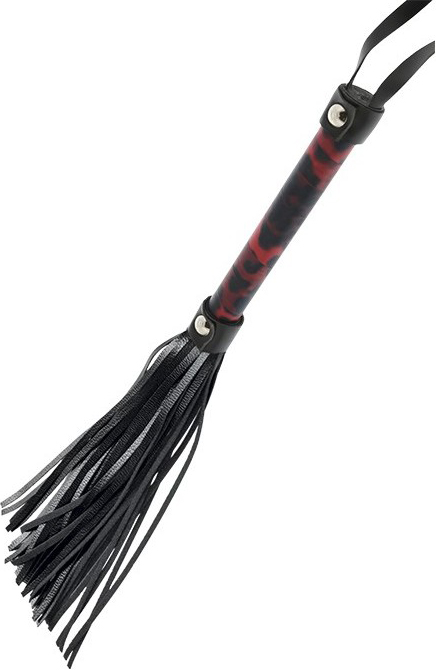 Flogger cu coarde cu aspect de piele de 24 cm lungime. Prindere ușoară cu un imprimeu de animale sălbatice și un șnur pentru încheietură.