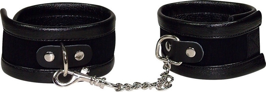 Catuse negre pentru glezne (30 x 5cm) confectionate din piele de caprioara cu margini din piele imitativa. Cu fermoar Velcro si un lant scurt de conectare cu lant de fixare (lungime 10cm)