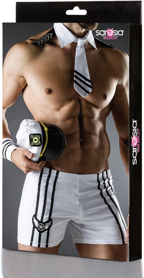 Costum de Capitan Sexy cu dungi dragute , nasturi si guler cu epoleti si cravata. Pantaloni scurti cu banda elastica, plasture decorativ pe picior, inclusiv mansete cu buton.Include : pantaloni scurti, palarie, guler, cravata, manseteTip tesatura : JerseyMaterial : 100% poliester