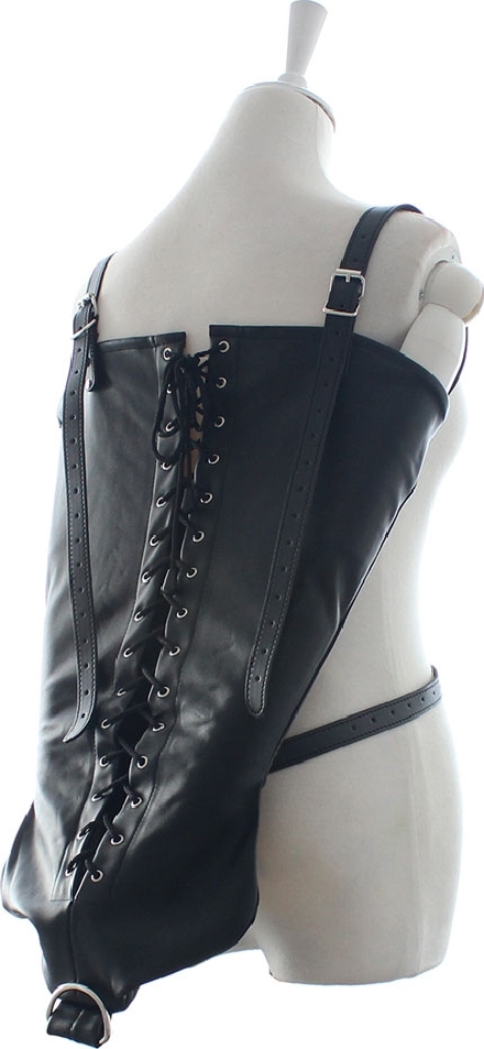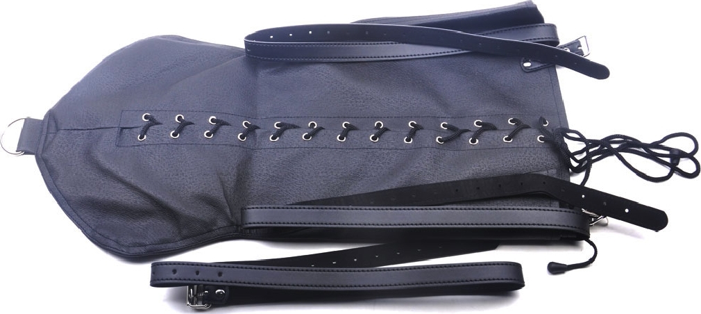 Un produs inedit dedicat practicantilor BDSM, acest dispozitiv pentru constrangere a bratelor restrictioneaza aproape complet miscarea bratelor si retine aspectul clasic al accesoriilor pentru bondage, gratie pielii ecologice din care este produs. Este reglabil datorita siretului si curelelor cu catarama, pentru o potrivire la fix si ofera control complet asupra partenerului.