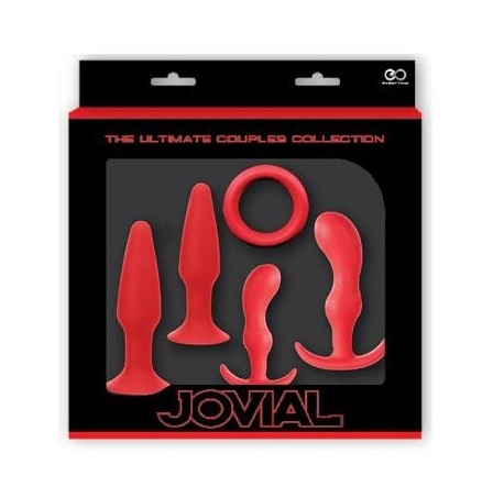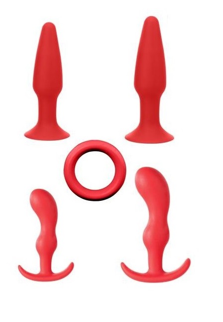 Acest kit de 5 jucarii anale se adreseaza tuturor, indiferent de sex, varsta si orientare sexuala. Potrivit pentru stimularea anala, atat pentru incepatori cat si pentru iubitorii sexualui anal. Aceste sunt fabricate din silicon rosu 100% hipoalergenic, foarte neted si catifelat, compatibil cu lubrifiantii pe baza de apa. Include: 1 dop conic mic- lungimea totala: 11,5 cm/ diametru: 2,7 cm 1 dop conic mare- lungimea totala: 12,5 cm/ diametru: 3,2 cm 1 stimulator prostata mic- lungimea totala: 10 cm/ diametru: 2,6 cm 1 stimulator prostata mare- lungimea totala: 12 cm/ diametru: 3,2 cm 1 inel penis- diametru interior: 4,2 cm