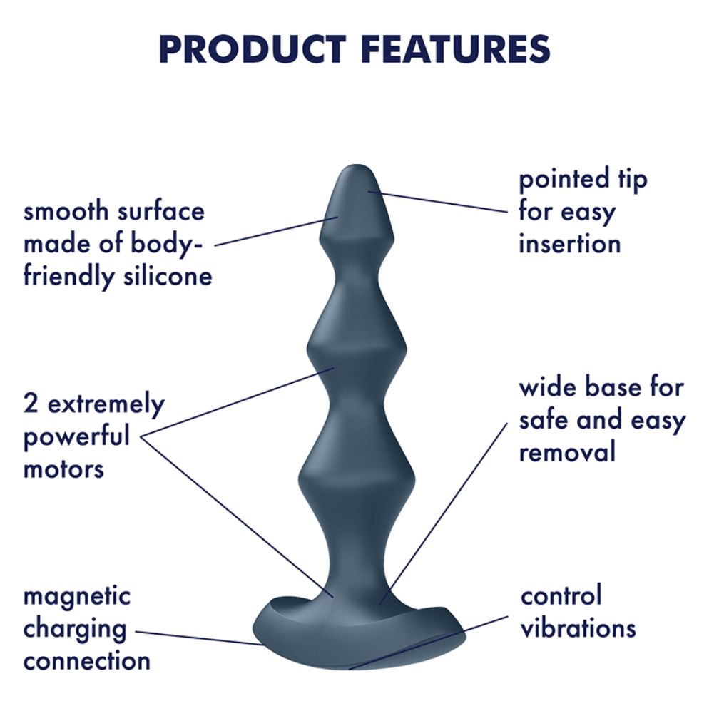 Bucura-te de masaje senzoriale anale si de prostata cu Satisfyer Lolli-Plug 2: Vibratorul anal cu o structura sferica ascendenta impresioneaza printr-o suprafata matasoasa si neteda, realizata din silicon prietenos cu corpul si este potrivit pentru barbati si femei. Cele 12 programe de vibrare ale celor 2 motoare pot fi controlate prin intermediul panoului de control intuitiv. Datorita modului impermeabil (IPX7) Lolli-Plug 2 te va insoti sub dus sau in cada. De asemenea, poate fi curatat usor cu apa calda si sapun. Pentru a te putea rasfata fara stres, vibratorul anal este echipat cu o baza larga care functioneaza si ca un maner. Daca Lolli-Plug 2 ramane fara putere, bateriile sale integrate pot fi reincarcate cu cablul de incarcare USB magnetic inclus. Pentru o mai buna experienta cu acest produs, utilizeaza intotdeuna un lubrifiant anal pe baza de apa.