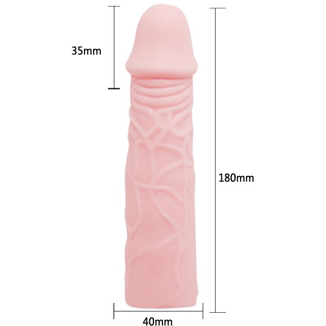 Obține lungime și grosime pentru penisul tău cu un manșon realist, cu un gland bine definit și vene pentru o experiență cu adevărat uimitoare. Materialul este elastic, moale și plăcut la atingere, sigur pentru corp, fără ftalați,  Diametrul interior al manșonului este de 3,5 cm. Folosiți întotdeuna un lubrifiant pe bază de apă atunci când rulați manșonul pe penis.