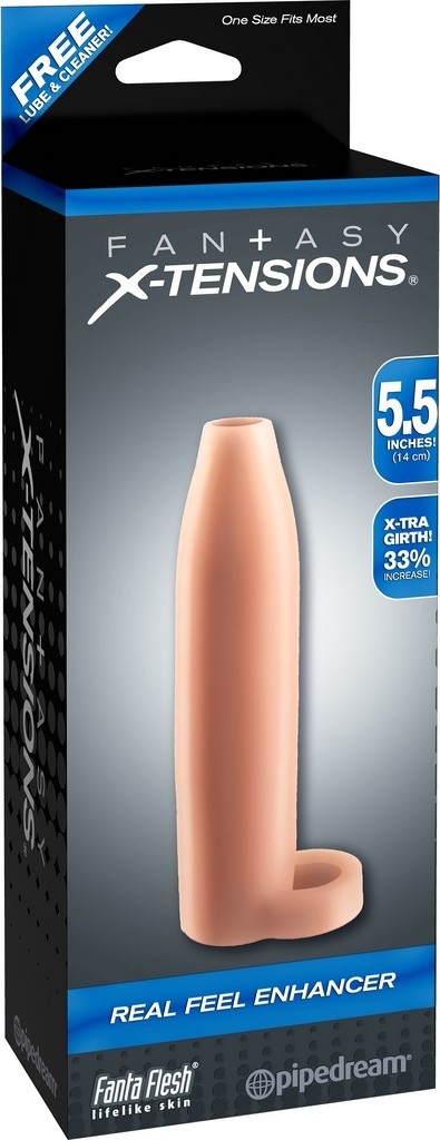 Transforma-ti penisul intr-o incredibila masinarie de oferit placere cu acest manson pentru penis Xtensions Real Feel. Poti fi un veritabil armasar in dormitor datorita acestui manson pentru marirea penisului.Creat ca o alternativa mai sigura, mai ieftina, pentru marirea in grosime a penisului, ce nu necesita interventia chirurgicala sau diferite pastile, mansonul Xtensions Real Feel pofera cel mai gros si satisfacator penis. Perfect pentru barbatii ce se confrunta cu diferite probleme de erectie. Xtensions Real Feel va oferi placeri irezistibile ambilor parteneri.Mansonul pentru penis Fantasy Xtension Real Feel 1 este o extensie ajustabila pentru penis. Masonul este decupat in partea superioara, neacoperind astfel capul penisului astfel incat poti simti fiecare senzatie si atingere naturala a partenerei. Este suficient de elastic pentru a se potrivii majoritatii marimilor si este prevazut cu inel ce se fixeaza in jurul testiculelor, avand rol in prelungirea actului sexual, intarziind momentul ejacularii si marind intensitatea orgasmului.Mareste grosimea penisului pana la 33%.Prevazut cu inel pentru testicule, ajuta la intarzierea ejacularii.Material ultra realist, Fanta Flesh.Culoare: naturala.Lungime aproximativ 14 cm. Diametru initial(foarte elastic) 4,4 cm(exterior) si 1,9 cm(interior)* Pachetul include mostra(10 ml) de lubrifiant si toy cleaner.