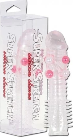 Super Stretch manson pentru penis, considerat printre cele mai bune mansone din silicon fabricat pana la ora actuala. Are forma penisului si perle care vor stimula puternic partenera. In varf este plin, marind penisul cu aprox. 3cm. Super Stretch are toate calitatile pentru a va oferi o satisfactie deplina atat dumneavoastra cat si partenerie: moale, fin, flexibil, foarte elastic. Prevazut cu striatii si cili foarte fini. Strange usor penisul si astfel mentine o erectie mai puternica. Se poate fixa pe penis sau vibrator. Dimensiuni manson: 14 x 3 cm.