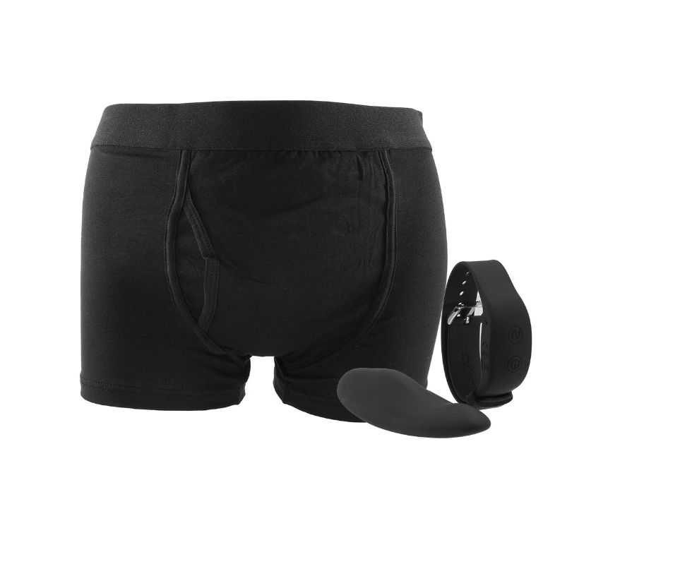 Acest set uimitor este creat pentru cei aventurosi, care cauta placere oriunde si oricand. Cu o pereche de boxeri extra confortabili (95% bumbac, 5% spandex) asociati cu un mini vibrator puternic si o telecomanda wireless discreta pentru incheietura mainii, sub forma de ceas. Controllerul elegant, dar discret va permite sa controlati cu usurinta intensitatea vibratiilor prin simpla apasare a unui buton. Ori de cate ori sau oriunde te duce pasiunea, raza de actiune de 10 metri a acestui mini vibrator si cele 12 functii de vibratii intense sunt gata de joc. Boxerii discreti si stransi (potriviti marimilor M/L) au 3 buzunare interne pentru plasarea personalizata a stimulatorului. Acesta are o forma curba, perfect ergonomica, ce se muleaza pe formele tale si este fabricat din silicon sigur pentru corp, foarte neted si matasos. Acesta se incarca cu USB-ul inclus timp de 1 ora pentru 40-55 de minute de joaca continua. Stimulatorul poate fi folosit de asemenea si fara boxeri, pe orice parte a corpului. Il puteti lua in siguranta la dus sau in cada deoarece este impermeabil.