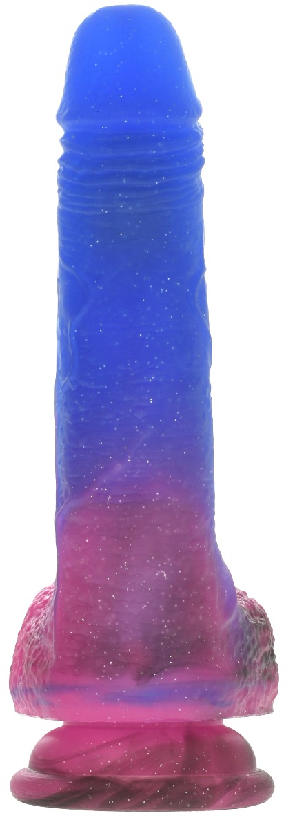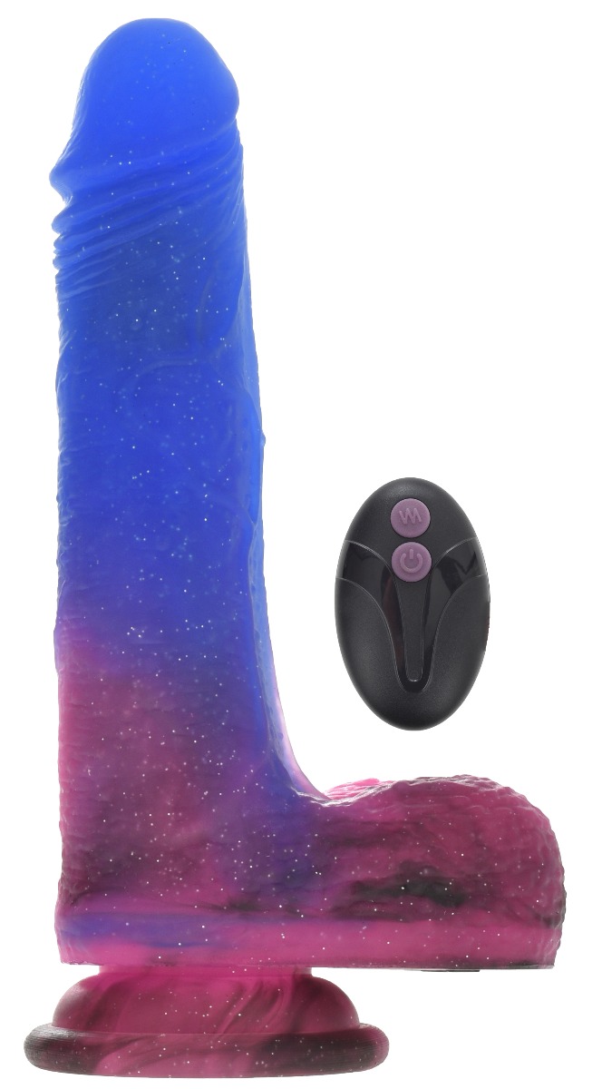 Traieste alaturi de noul vibrator Galaxy o experienta aproape de stele, intr-o alta…galaxie! Structura realista, cu gland definit, vene proeminente si testicule texturate, este intrecuta doar de paleta cromatica deosebita. In plus, sclipiciul imprastiat pe toata suprafata sa te trimite cu gandul la un foc de artificii. Exact cum te vei simti si tu la finalul experientei cu acest dildo: divin! Materialul din care este fabricat este silicon lichid, un material premium, cu calitati superioare celorlalte materiale existente pe piata. Moale la suprafata pentru o senzatie de penis adevarat, ferm la interior pentru penetrari puternice. Telecomanda wireless cu care este prevazut vibratorul controleaza cele 7 moduri de vibratii si 7 moduri de rotatii. Aceste doua setari functioneaza doar impreuna pentru orgasme atat de intense. In plus, daca vrei sa revii la modul de inceput, apasa butonul ON/OFF si le va relua de la capat. Ventuza de la baza se fixeaza pe orice suprafata plana si neteda pentru un joc fara maini intens. Materialul desoebit, pe langa faptul ca preia rapid temperatura corpului si o pastreaza pentru experiente placute si confortabile, este compatibil doar cu lubrifiantii pe baza de apa. Vibratorul este rezistent la apa, astfel ca il poti lua cu tine in siguranta in cada sau la dus pentru senzatii subacvatice uimitoare. Atentie! Telecomanda nu este impermeabila! Incarcarea se face cu USB-ul inclus timp de 90 de minute pentru 60-90 de minute de joaca in functie de setarile folosite. Telecomanda functioneaza cu 1 baterie inclusa.