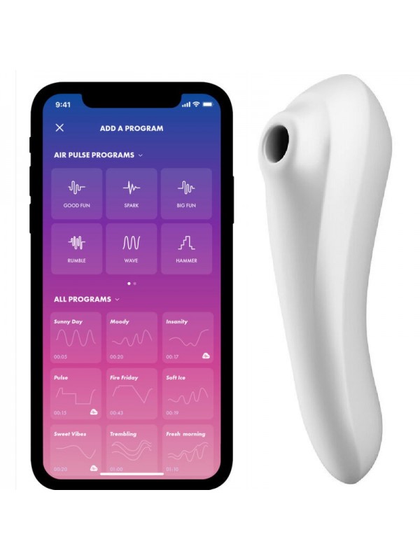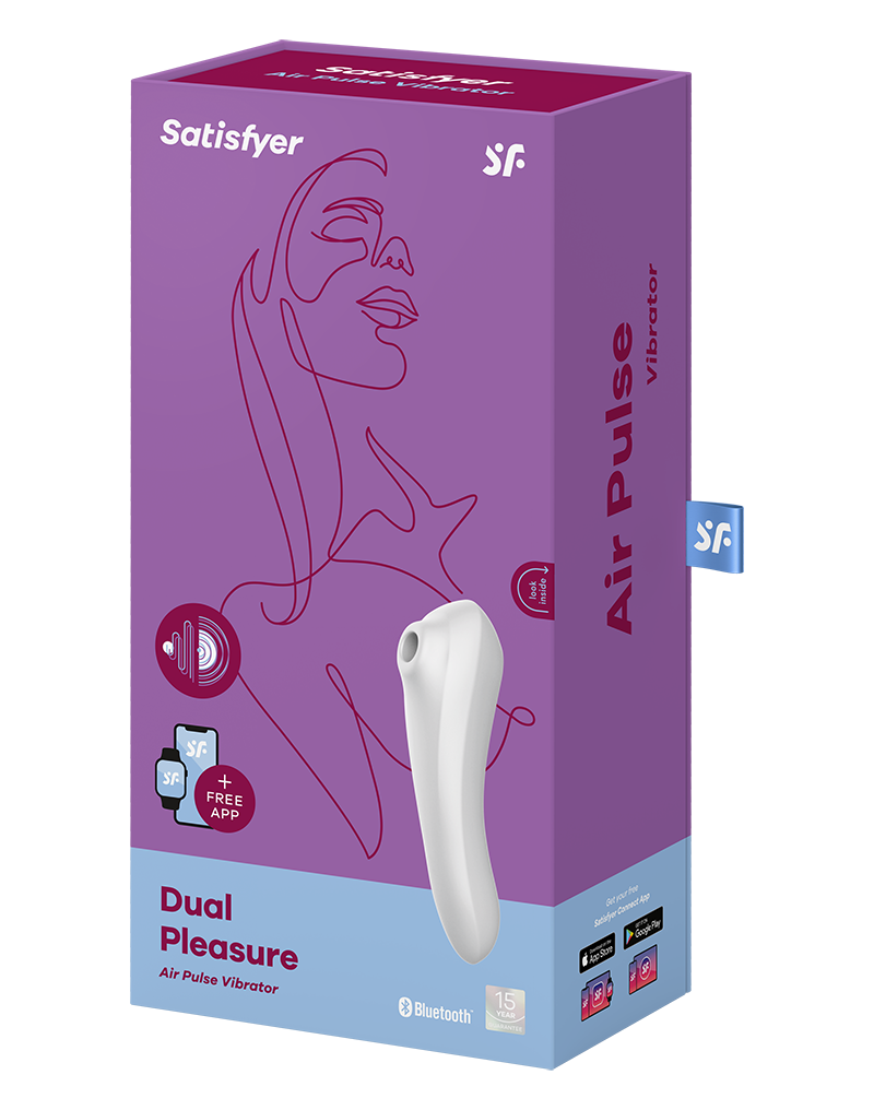 Dublati distractia, dublati placerea – noul Satisfyer Dual Pleasure este un stimulator de clitoris cu Bluetooth si un vibrator intern pentru punctul G! Designul elegant al acestuia prezinta aspecte multifunctionale, cu optiunea de a controla independent undele de presiune ale presiunii aerului pentru clitoris sau de a stimula punctul G cu vibratii, datorita formei curbate. Suprafata neteda din silicon Mod silentios Silicon 100% sigur pentru corp Compatibil cu orice telefon, tableta sau ceas Android sau Apple Stimulator unic puternic pentru clitoris si vibrator intern pentru punctul G Aplicatia Satisfyer Connect Poate fi folosit si fara aplicatie Reincarcare magnetica 100% rezistent la apa Datorita aplicatiei Satisfyer Connect, este posibil sa experimentezi aventuri pasionale complet noi! Descarcati gratuit aplicatia pentru iOS si Android pe telefon, tableta sau Apple Watch. Apoi puteti conecta cu usurinta Satisfyer prin Bluetooth sau internet. Trimite sunete ambientale sub forma de vibratii, lasa-ti Satisfyer-ul sa fie controlat de altcineva sau creeaza singur un ritm incitant sau transforma lista de redare Spotify preferata intr-o vibratie senzuala: creativitatea ta nu are limite!