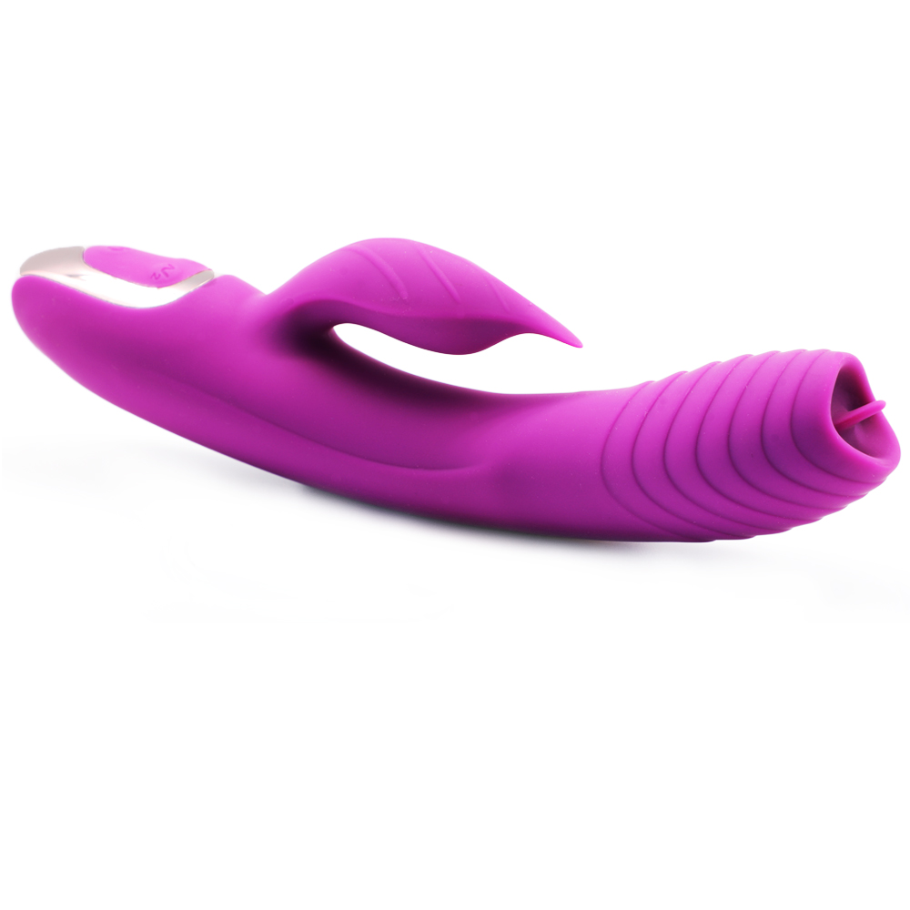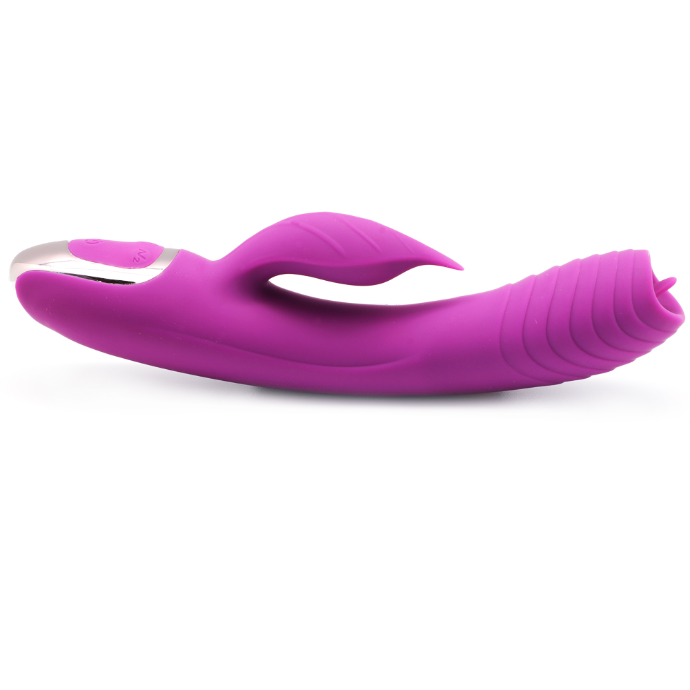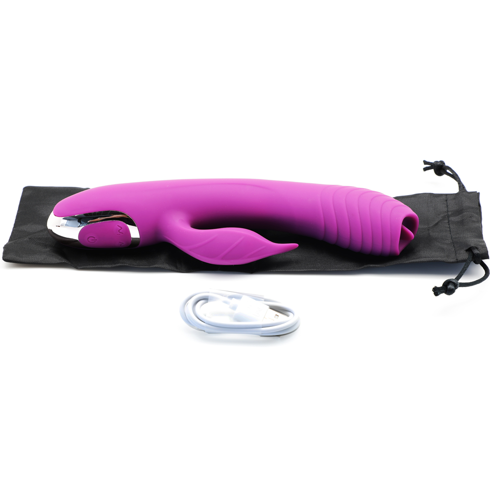 Vibratorul Tongue are un design unic, elegant, inovator! Stimulatorul clitoridian are o forma de frunza, cu nervuri si un varf ascutit, ce iti stimuleaza atat de puternic clitorisul incat nu vei mai dori niciodata sa incerci altceva. Axul principal insa nu are forma obisnuita, neteda ce iti stimuleaza intern punctele sensibile cu vibratii. In locul varfului subtire este o limba delicata ce ajunga profund, adanc pentru senzatii coplesitoare, naucitoare. In jurul limbutei se afla creste stimulatoare ce asigura placeri intense la fiecare penetrare. Fiecare dintre cele doua stimulatoare vibreaza cu cate 10 moduri de vibratii diferite, fiind independente, actionate de cate un motor puternic fiecare. Astfel poti sa-ti personalizezi sesiunea amoroasa in functie de preferinte, deoarece vibratiilor celor doua brate sunt activate de la butoane separate. Vibratorul este imbracat intr-un silicon de inalta calitate, 100% sigur pentru corp, fara ftalati, placut la atingere iar panoul de incontrol este evidentiat de o rama cu aspect metalic roz. Se incarca convenabil cu USB-ul inclus si este rezistent la stropirea cu apa. Il poti spala sub un jet de apa dupa fiecare utilizare sau il poti lua cu tine la dus pentru aventuri erotice palpitante. Include un saculet de depozitare. Pentru intensificarea senzatiilor utilizati impreuna cu vibratorul un lubrifiant pe baza de apa. Acest produs beneficiaza de garantie timp de 2 ani de la achizitie!