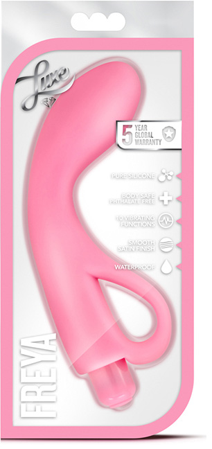 Vibratorul Luxe Freya este un vibrator cu o constructie solida pentru stimularea punctului G, datorita formei sale curbate poate atinge punctele erogene cu usurinta. Design-ul sau ergonomic permite o operare cat mai confortabila. Dragut, discret si conceput pentru orgasme puternice, este un vibrator creat de catre femei pentru femei, fabricat din silicon de inalta calitate cu un finisaj neted si catifelat ce aluneca fara probleme odata lubrifiat. Este rezistent la apa pentru a te putea satisface inclusiv la dus sau in cada. Necesita o singura baterie AAA.