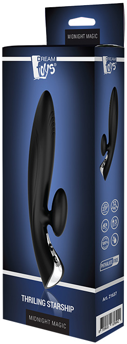 Exploreaza-ti corpul si propriile fantezii! Imagineaza-ti o lume a placerii interzise si a pasiunilor dezlantuite si pleaca in aventura vietii tale! Te insoteste bineinteles noul vibrator “Thrilling Starship”! Cu forma sa, asemenea unei nave spatiale, te va ajuta sa-ti descoperi placerile si slabiciunile! Acoperit cu un silicon de cea mai buna calitate, moale si neted la atinge, sigur pentru corp, hipoalergenic, acest vibrator te stimuleaza atat vaginal cat si clitoridian! Cele 2 motoare puternice care ofera 3 niveluri de vibratii constante si 9 ritmuri diferite, se afla localizate in bratul principal si in stimulatorul clitoridian. Bratul are o forma lungita, prevazuta cu mici striatii localizate in partea superioara a vibratorului pentru o extra stimulare a muschilor vaginali. Rezistent la stropire cu apa! Clasa de impermeabilitate: IPX5 Vezi standardul de impermeabilitate pentru acest produs!