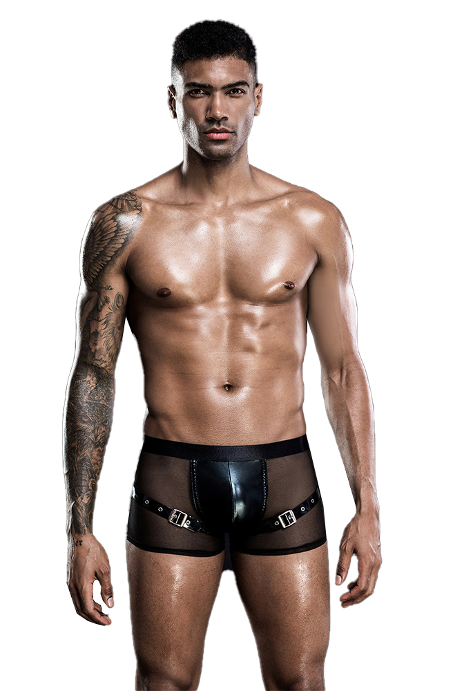Boxeri barbatesti in stilul clasic si consacrat BDSM! Materialul lucios wetlook in zona intima, plasa fina transparenta pe solduri si fese si cataramele metalice asigura jocuri obraznice. Material: 87 Poliester,13% Elastan