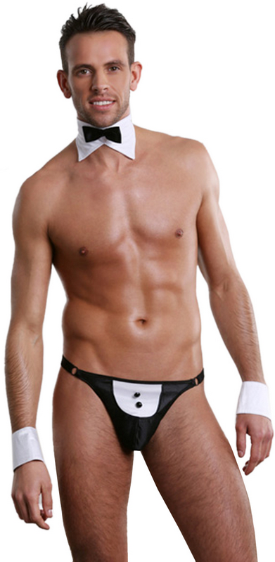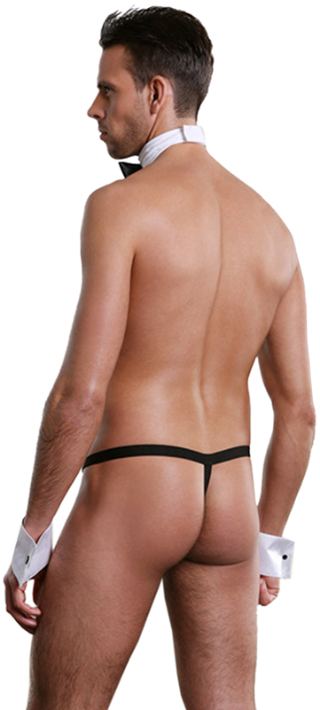 Iubitului tau ii place sa-ti satisfaca toate nevoile si dorintele? Atunci fa-i cadou o costumatie sexy de majordom si va fi obligat sa-ti indeplineasca si placerile mai putin decente. Setul include bikini, guler cu papion si mansete pentru un look cu adevarat provocator. Caracteristici sexy: combinatie alb/negru incantatoare; guler cu inchidere velcro si papion elegant atasat; mansete lucioasa cu capse; bretele elastice si nasturi decorativi-ce deliciu! material elastic (92%Poliester, 8%Elastan); marime universala pentru S,M,L.
