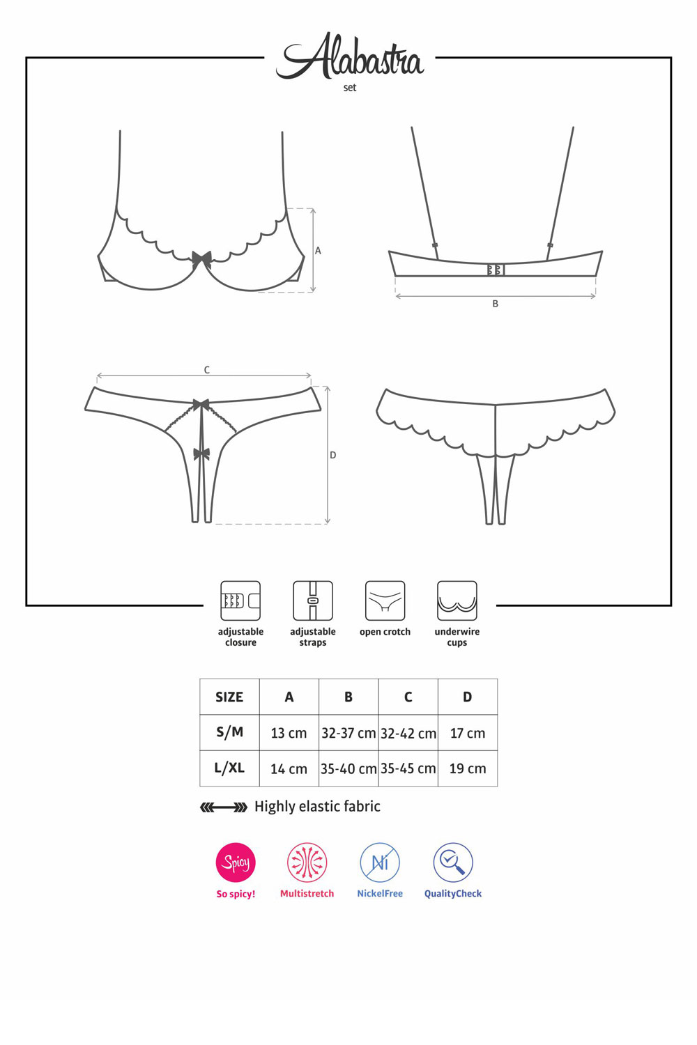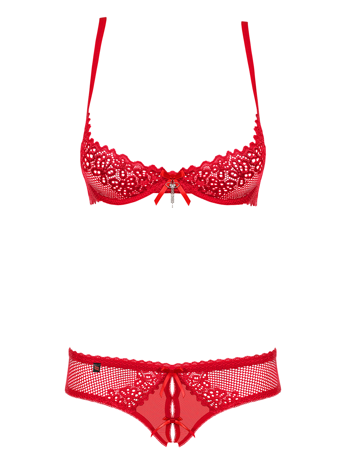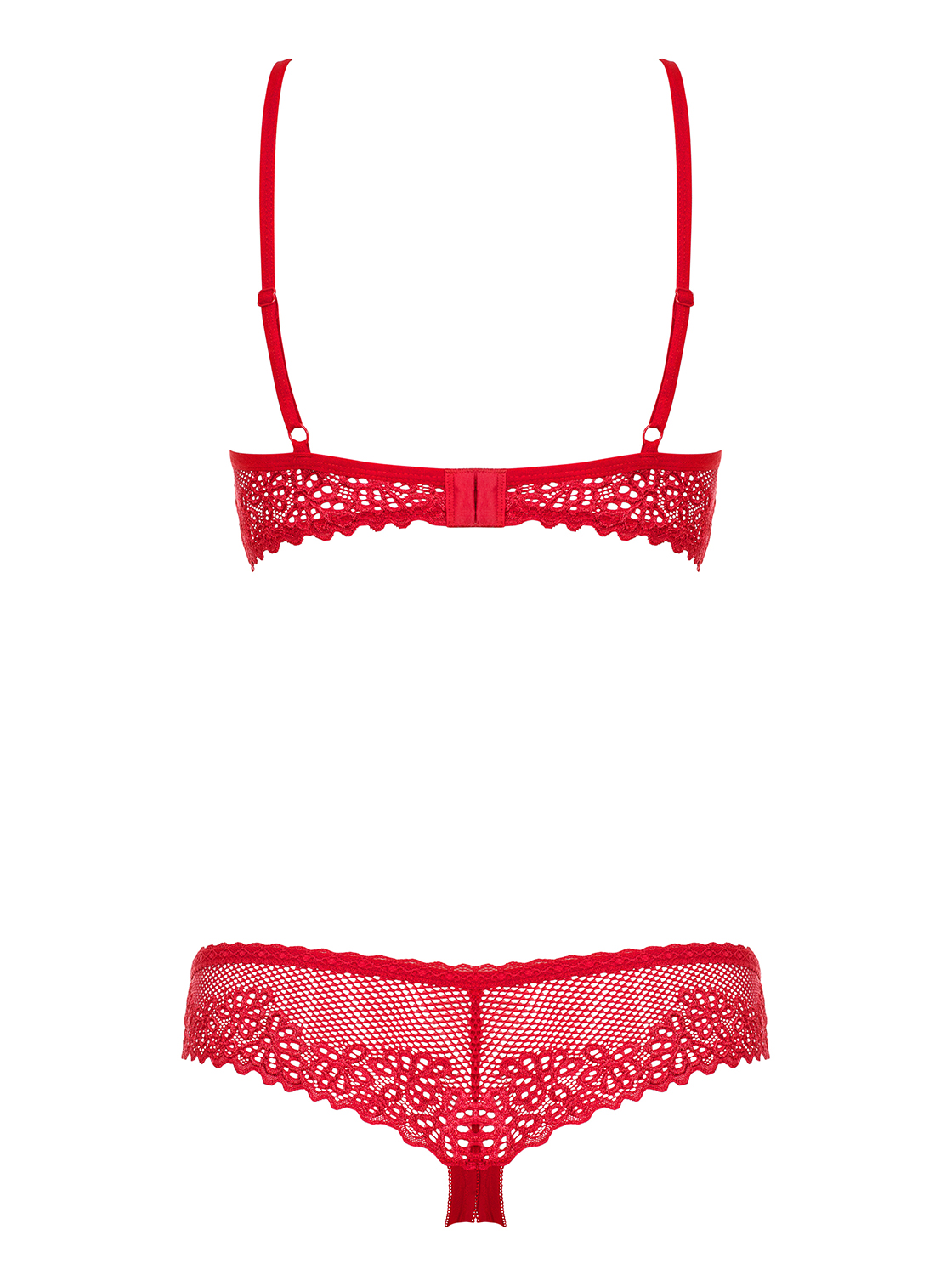 Inchideti ochii si imaginati-va lenjeria intima perfecta, senzuala si confortabila in acelasi timp. Croiala fina, material delicat si un look atat de sexy! Adaugati dantela fermecatoare, rosu fenomenal si un design minunat si veti obtine setul Alabastra! In aceasta lenjerie intima, alaturi de iubitul tau, vei straluci. Fundita dintre sani iti va oferi stil, iar dantela super sexy iti va incalzi simturile. Detalii: sutien cu jumatate de cupa si bikini deschisi in zona intima tesatura din dantela rosie – eleganta clasica bretele reglabile – confort la purtare inchiderea reglabila a sutienului garanteaza o potrivire perfecta cupe cu balene pentru sustinere si o evidentiere mai buna a bustului detaliu stralucitor intre cupe setul include sutien si bikini material placut cu elasticitate exceptionala (90% poliamida, 10% elastan).