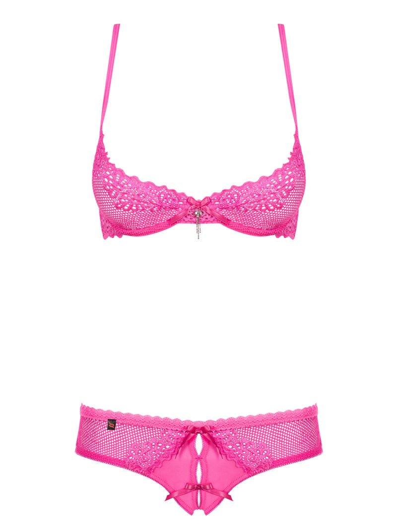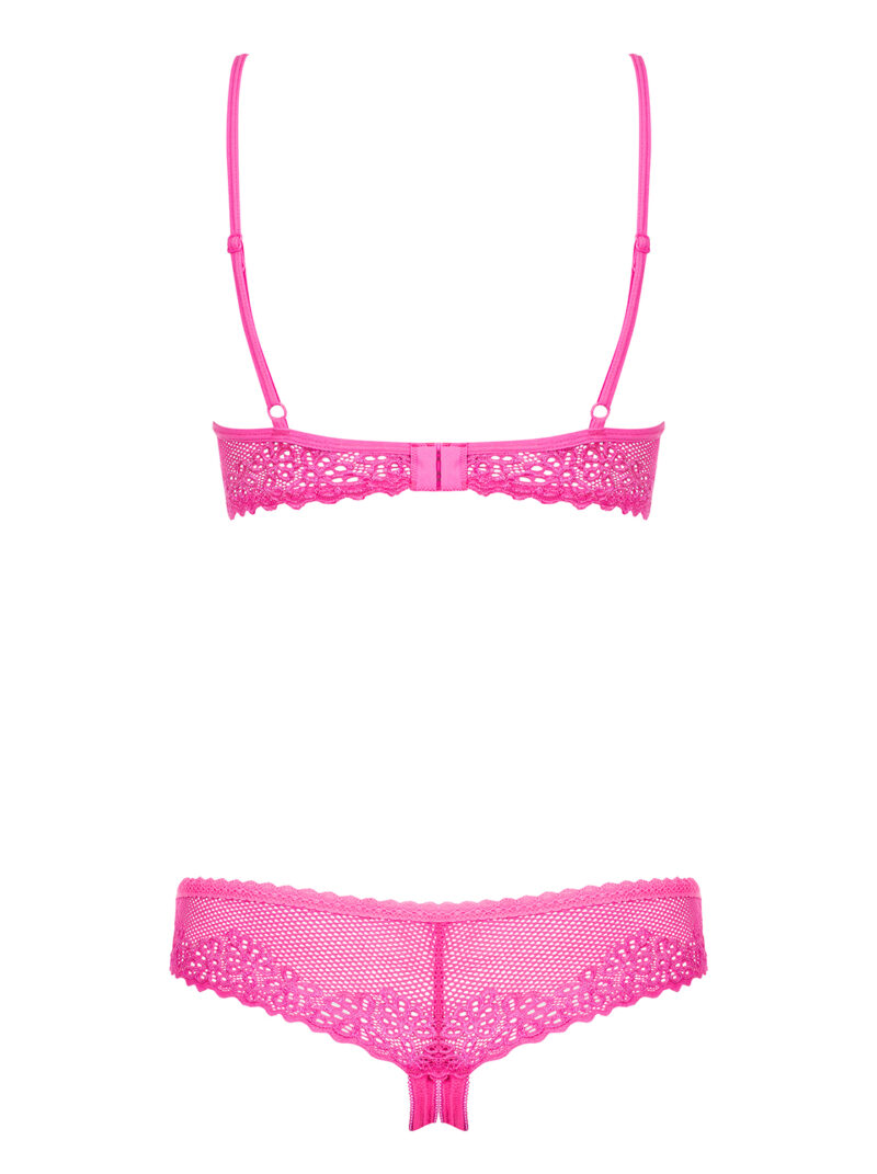 Inchideti ochii si imaginati-va lenjeria intima perfecta, senzuala si confortabila in acelasi timp. Croiala fina, material delicat si un look atat de sexy! Adaugati dantela fermecatoare, culoare fenomenala si un design minunat si veti obtine setul Alabastra! In aceasta lenjerie intima, alaturi de iubitul tau, vei straluci. Fundita dintre sani iti va oferi stil, iar dantela super sexy iti va incalzi simturile. Detalii: sutien cu jumatate de cupa si bikini deschisi in zona intima tesatura din dantela roz neon bretele reglabile – confort la purtare inchiderea reglabila a sutienului garanteaza o potrivire perfecta cupe cu balene pentru sustinere si o evidentiere mai buna a bustului detaliu stralucitor intre cupe setul include sutien si bikini material placut cu elasticitate exceptionala (90% poliamida, 10% elastan).