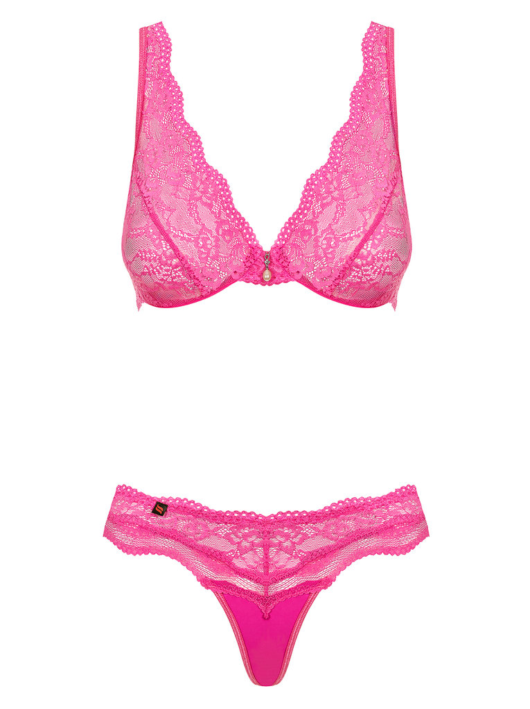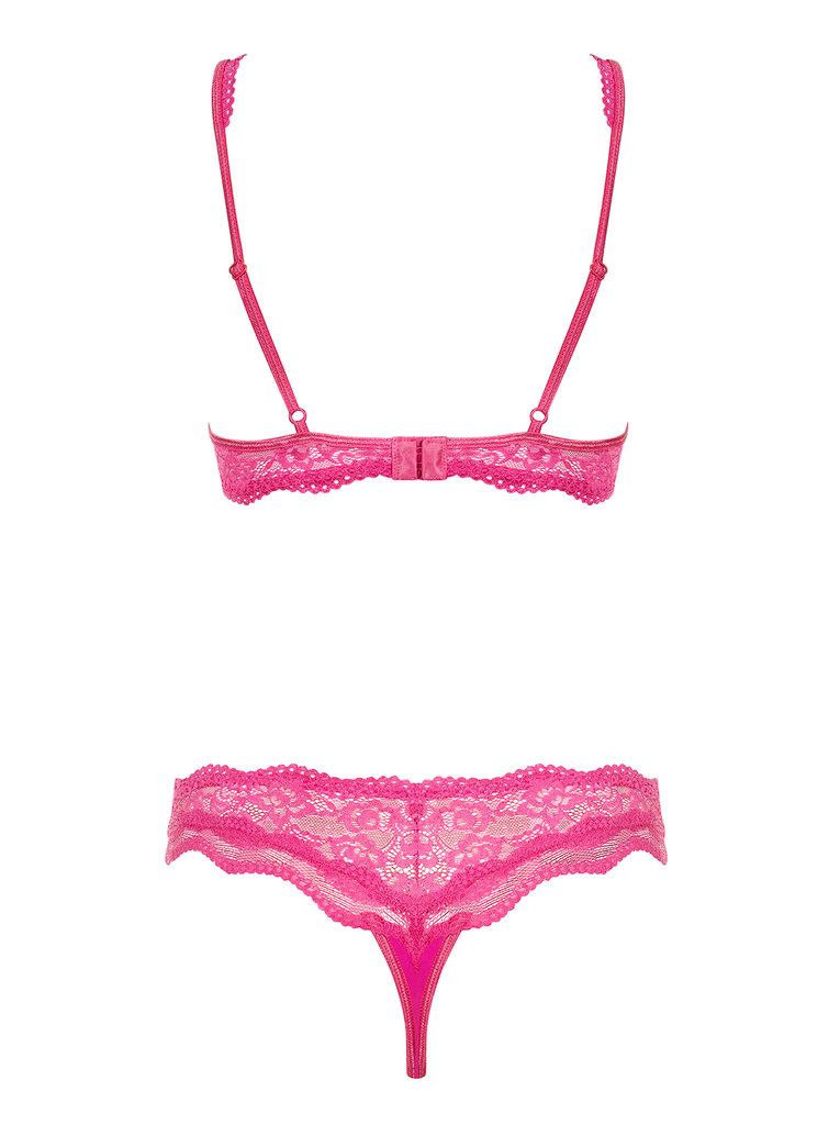 Astazi iti indeplinim fanteziile cu dantela fina. Ce zici de lenjerie intima senzuala intr-o culoare unica, distractiva, care stimuleaza simturile? Dantela roz, croiala sexy, forme accentuate de minune si un accesoriu feminin intre sani. Inchide ochii si imagineaza-ti sanii fenomenal accentuati si fesele expuse senzual. Vrei sa incerci? Detalii: set din dantela roz: sutien si chiloti bretele reglabile, inchiderea sutienului in mai multe etape – potrivire perfecta cupele cu sarma subliniaza perfect bustul pandantiv fantastic intre sani material elastic (90% poliamida, 10% elastan).